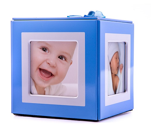 • Caja para bebé Esta preciosa cajita para guardar las cositas más personales del tu bebé se puede personalizar con cuatro fotos del pequeño, aportándole un valor emotivo súper especial.