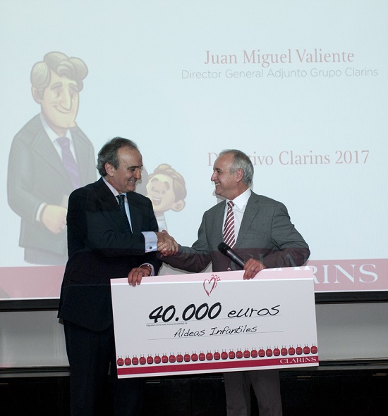 Juan Miguel Valiente, Director General Adjunto del Grupo Clarins España ha sido, en esta ocasión, quien ha entregado el donativo de 40,000 € al presidente de Aldeas Infantiles SOS Pedro Puig.
