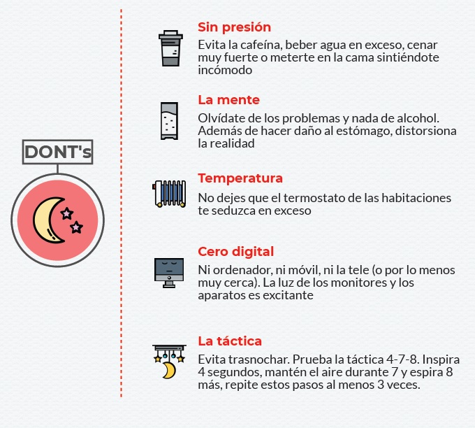 Evita trasnochar, ya que el sueño es un ejercicio rutinario y el cuerpo se acostumbra a unas horas concretas. Si aun así, el sueño se te resiste, puedes utilizar la táctica 4-7-8. Inspirar 4 segundos, mantener el aire durante 7, espirar 8 segundos más, y repetir al menos 3 veces.
