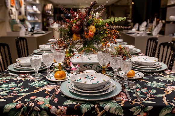 En esta ocasión la protagonista de su mesa fue la vajilla Famille Verte, una de sus favoritas por la elegancia de sus motivos decorativos y porque es un eco de las antiguas porcelanas de Compañía de Indias. Esta colección, pintada en tintas de esmalte transparentes, en las que predominan los tonos verdes, cuenta con un gracioso padrón de hojas, frutos y mariposas que deriva directamente del antiguo Palácio da China-Palacio de China.