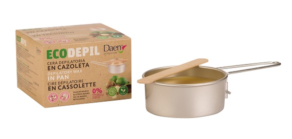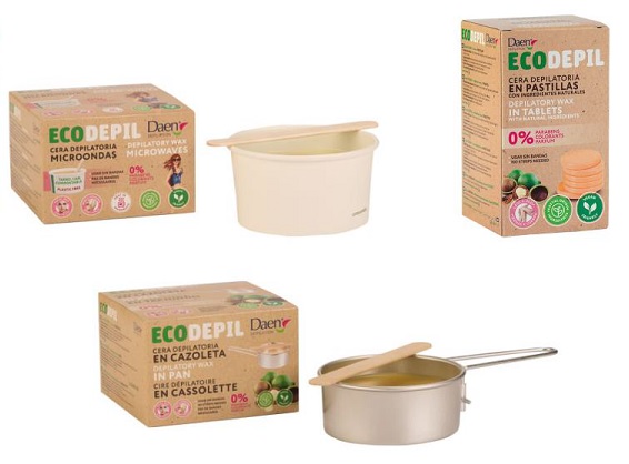 DAEN ECODEPIL es la gama de depilación de DAEN que ha marcado un antes y un después en depilación con su carácter ECOFriendly. A sus bandas faciales y corporales de cera fría se añade ahora como novedad la cera caliente en 3 formatos: cera tibia para el microondas en un atractivo tarro compostable, cera caliente en aluminio reutilizable, y la cera de recarga en pastillas. En ninguno de ellos hay presencia de plástico, para contribuir al cuidado del medioambiente.