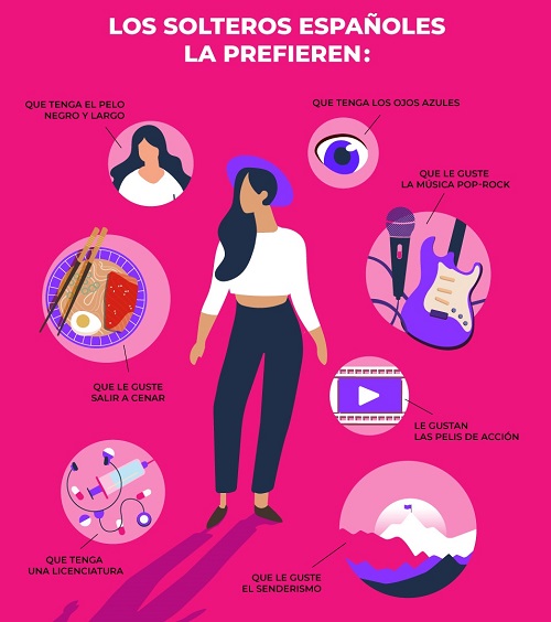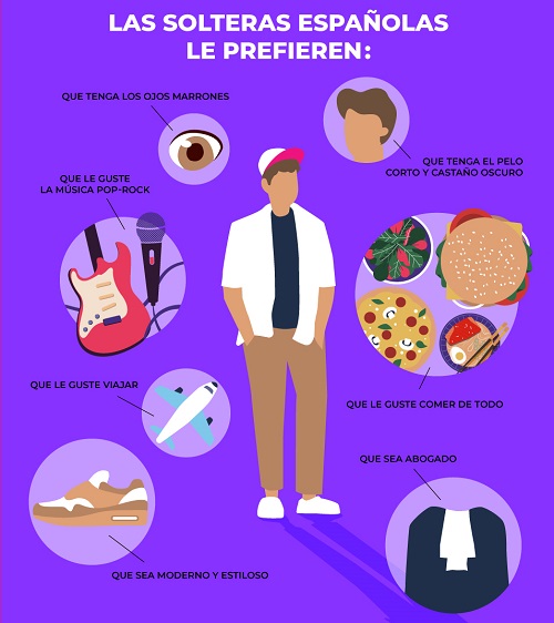 A diferencia del género masculino, las solteras de España prefieren a los hombres muy altos; y de aspecto latino, esto es, cabello castaño oscuro corto, una mirada penetrante y profunda de ojos marrones, y una sonrisa permanente. Y sobre todo que sean unos románticos empedernidos.