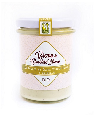 Chocolate blanco. Crema BIO de Comercio Justo de chocolate blanco con aceite de oliva virgen extra (variedad Empeltre), azúcar integral, manteca de cacao, leche entera en polvo, lecitina de soja y vainilla (variedad Bourbon).