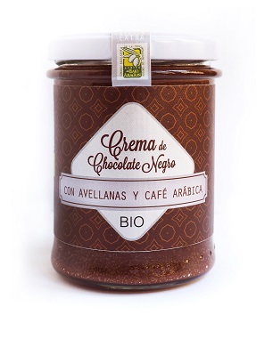 Cocolate + Café Arábica + Avellanas. Crema BIO de Comercio Justo de chocolate con avellanas, café Arábica de Nicaragua, aceite de oliva virgen extra (variedad Empeltre), azúcar de caña, panela, lecitina de girasol y vainilla.