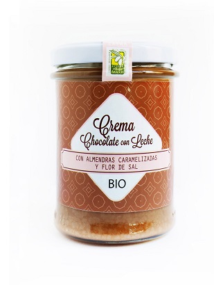 Chocolate con leche + Almendras caramelizadas. Crema BIO de Comercio Justo de chocolate con leche (leche en polvo entera), aceite de oliva virgen extra (variedad Empeltre), almendras marconas caramelizadas, pasta y manteca de cacao, miel de romero, azúcar de caña, vainilla y flor de sal.
