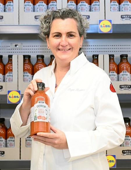 Lidl y la Chef Pepa Muñoz se han unido para lanzar su nuevo gazpacho ‘Origen y Tradición’, el único elaborado con tomate Rosa y cuya recetaincorpora los mejores ingredientes de origen nacional. Con él, Lidl recupera una variedad de tomate muy antigua y prácticamente en desuso en la gran distribución, debido a su gran tamaño, peso y aspecto desigual; pero de gran sabor y valor gastronómico.