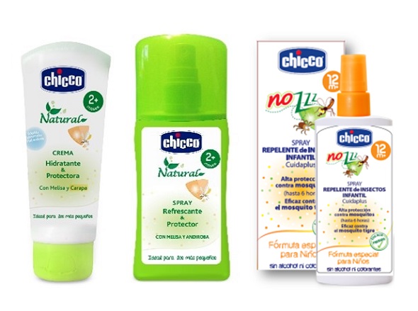Chicco cuenta con la gama más amplia de protectores frente a agentes externos: tanto lociones naturales como repelentes. Su loción natural con aceites de Melisa y Andiroba, conocidas por ser sustancias de aroma repelente para los insectos, tiene propiedades hidratantes y carece de añadidos químicos. Además de estar testado dermatológicamente y ofrecerse en crema o spray, puede ser empleado en bebés de más de 2 meses garantizando hasta dos horas de protección. El repelente antimosquitos está indicado para niños mayores de 12 meses, dada su fórmula especial, y su eficacia testada garantiza una alta protección (hasta 6 horas), incluso contra el mosquito tigre. El PVPR de la loción natural es 9,65€ y del repelente, 9,95€.