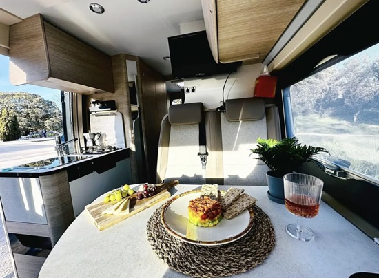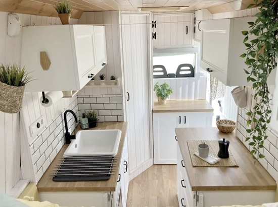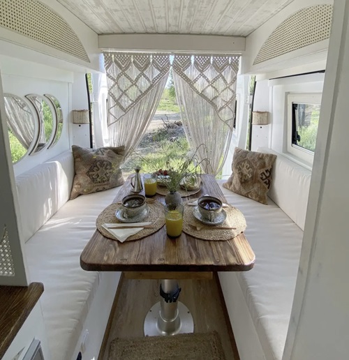 La siguiente camper también destaca por su interiorismo. Si pasas horas en tu moodboard, buscando tips de decoración y cómo sacar el máximo provecho a los espacios, entonces esta camper te encantará. Ya sea por sus espacios limpios, que reflejan la luz o su estética simple pero bien pensada, esta camper invita a inspirarse y viajar.