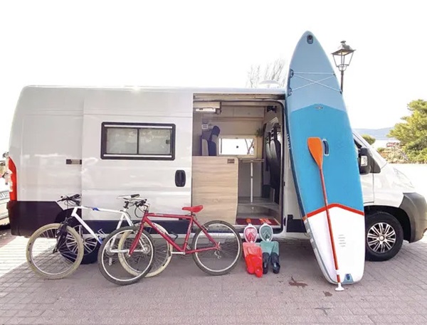Bicicletas, paddle surf, máscaras de snorkel… en esta furgo encontrarás todo lo necesario para una escapada llena de aventura, emoción y deportes al aire libre. Si además quieres registrarlo todo, incluye una carcasa estanca para grabar vídeos bajo el agua. ¡Luz, cámara y mucha acción!