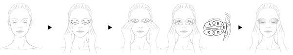 2. Usando tres dedos (índice, corazón y anular), masajear lenta y suavemente desde el ángulo interno del ojo hasta la sien. Masajear repetidamente tanto el párpado superior como el inferior hasta que la esencia quede absorbida en la piel.