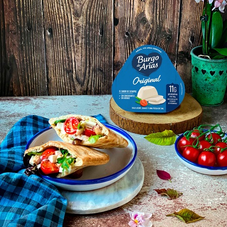 Pan pita con pollo, tomatitos y Burgo de Arias Original
