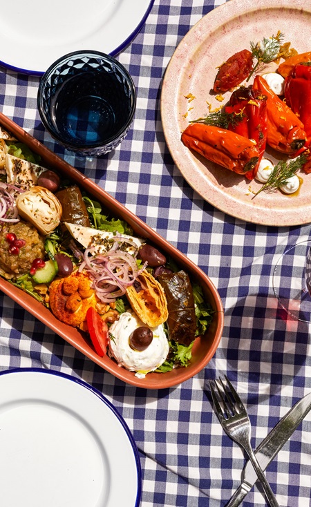 Para compartir hay mezés (surtido de aperitivos). Entre ellos, bocados hojaldrados, envueltos en hojas de parra, quesos, cremas de garbanzos (el hummus de pimiento es una auténtica delicia), tzatziki o berenjenas asadas al carbón, por poner algunos ejemplos.