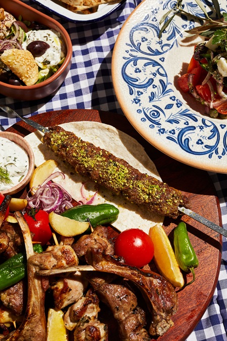 La parrillada de carne a la basa es una muy buena entrada a la cultura gastronómica griega: entre las viandas, un plato estrella: souvlaki me fistiki, una brocheta de carne picada mezclada con un poco de ternera elaborada con pistachos. ¡Una delicia!