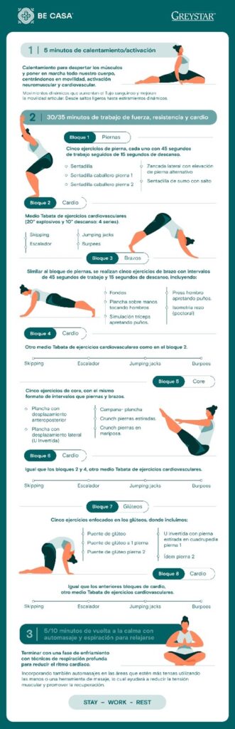 Tras estas pautas de hábitos saludables, la entrenadora personal acercó un programa de entrenamiento full body sin material dividido en tres fases que todos podemos realizar desde casa invirtiendo tan solo 45/50 minutos en nuestra salud: