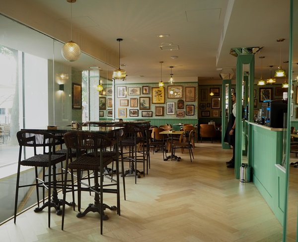 Un producto de diez, en un rincón de cine, y nunca mejor dicho, ya que la decoración de Obradores Madrid es obra de Ana Palazón (Anuski) y Jose Luis Arrizabalaga (Arri), coordinadora de arte y director de arte de Alex de la Iglesia respectivamente, que han creado un local para sentirse como en casa, con influencia de varios estilos de interiorismo y donde está cuidado hasta el más mínimo detalle, desde la pared principal del fondo de la sala repleta de láminas de árboles, las mesas de mármol, las molduras de madera lacada de los mostradores, el suelo de madera de fresno laminada, los espejos biselados de las columnas, todo hecho a medida, el papel pintado de William Morris o el sofá chester y los diferentes sillones y sillas. El broche lo pone la agradable y amplia terraza en la misma calle Narváez que se puede ver desde los amplios ventanales del local.