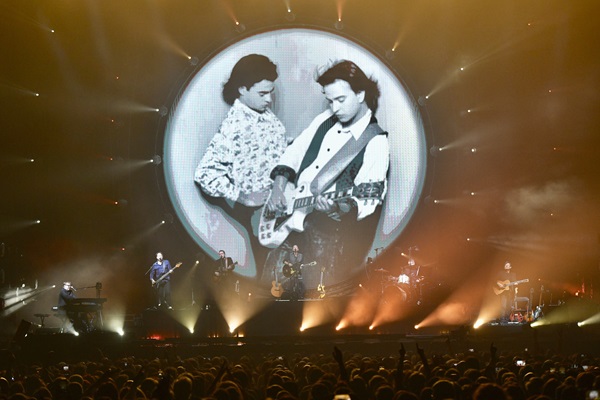 El concierto empezó con imágenes que mezclaban el presente y el pasado del grupo, proyectadas sobre una gran pantalla redonda dando la introducción al concierto.