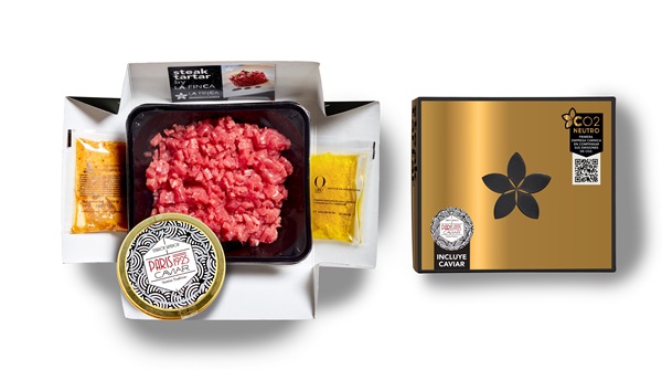 La Finca distribuye este excepcional plato en una caja que contiene, por un lado, 175 gramos de carne tierna y jugosa cortada con delicadeza, dentro de un práctico envase con una presentación impecable y, por otro, un sobre con salsa clásica para aderezar (aceite de oliva virgen, cebolla, mostaza, vinagre, sal, mayonesa, kétchup, salsa barbacoa y tabasco) y un sobre de aceite de oliva virgen extra Oro Bailén a los que acompaña, solo esta temporada, una lata de Caviar Paris 1925 procedente de esturión blanco italiano para que solamente tengas que preocuparte de abrir, mezclar, aderezar al gusto y comer. ¿El resultado? Un tartar elegante donde la carne se realza con el sutil sabor umami del caviar.