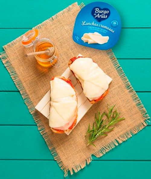 Cada rebanada se unta con dos cucharadas de sobrasada y se colocan encima dos lonchas de queso Burgo de Arias. Se hornea durante unos cuatro minutos, hasta que el queso esté fundido.